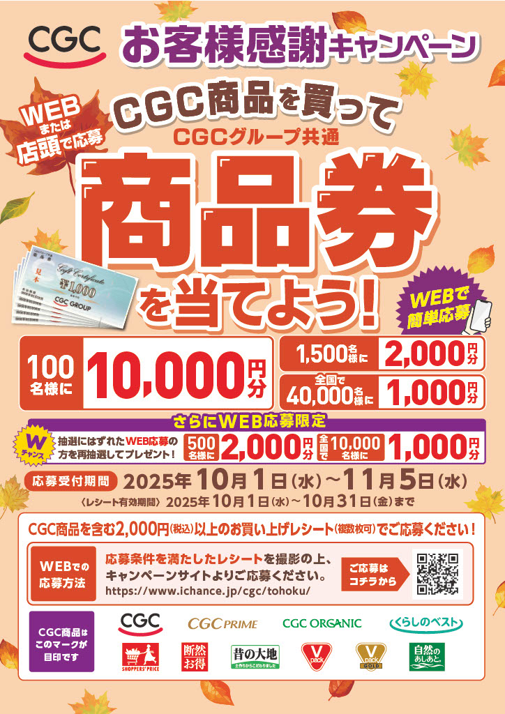 お知らせ CGCお客様感謝キャンペーン開催中 キャンペーン 2025/10/01 WEB応募はこちらからどうぞ 前の記事 お知らせ一覧 記事カテゴリー お知らせ (2) キャンペーン (1) 過去記事 2025年 10月 (1) 2024年 10月 (1) 2023年 5月 (1)